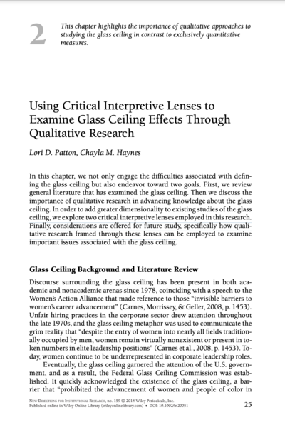 First, we review general literature that has examined the glass ceiling. Then we discuss the importance of qualitative research in advancing knowledge about the glass ceiling. In order to add greater dimensionality to existing studies of the glass ceiling, we explore two critical interpretive lenses employed in this research.