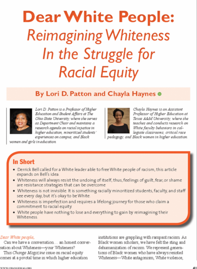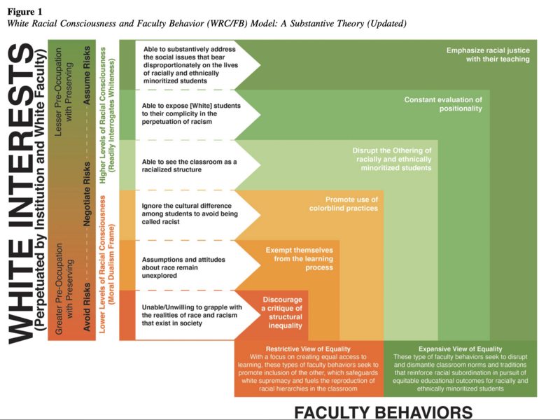 This article presents the White racial consciousness and faculty behavior (WRC/FB) model, which emerged from a constructivist grounded theory study I conducted. The WRC/FB model represents the inextricable link between racial consciousness and White faculty behaviors that either challenge or serve White interests and, consequently, White supremacy. This research broadens the higher education literature on teaching and learning by using Kimberlé Crenshaw’s restrictive and expansive views of equality framework and Derrick Bell’s interest convergence principle to establish a connection between advancing racial justice and excellence in college teaching.