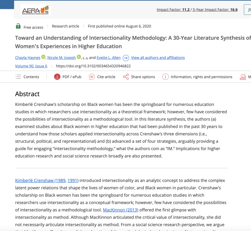 Kimberlé Crenshaw’s scholarship on Black women has been the springboard for numerous education studies in which researchers use intersectionality as a theoretical framework; however, few have considered the possibilities of intersectionality as a methodological tool. In this literature synthesis, the authors (a) examined studies about Black women in higher education that had been published in the past 30 years to understand how those scholars applied intersectionality across Crenshaw’s three dimensions (i.e., structural, political, and representational) and (b) advanced a set of four strategies, arguably providing a guide for engaging “intersectionality methodology,” what the authors coin as “IM.” Implications for higher education research and social science research broadly are also presented.