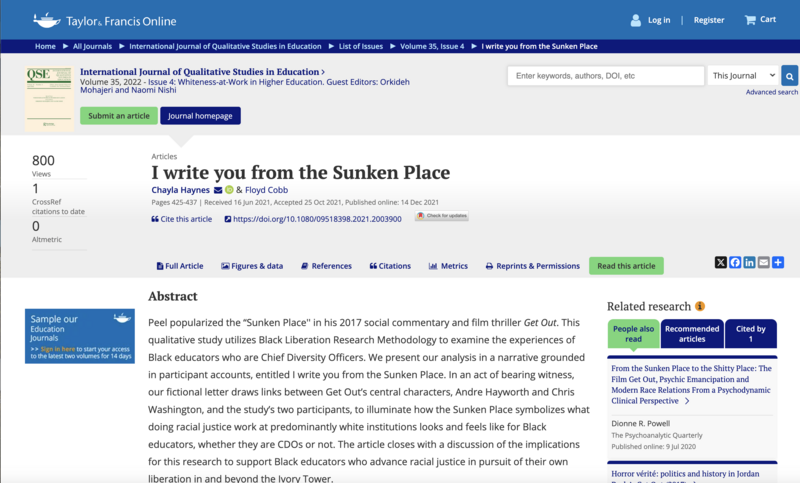 Peel popularized the “Sunken Place'' in his 2017 social commentary and film thriller Get Out. This qualitative study utilizes Black Liberation Research Methodology to examine the experiences of Black educators who are Chief Diversity Officers. We present our analysis in a narrative grounded in participant accounts, entitled I write you from the Sunken Place.