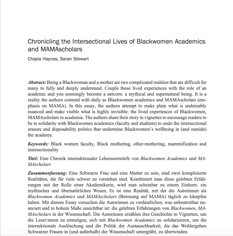 Being a Blackwoman and a mother are two complicated realities that are difficult for many to fully and deeply understand. Couple those lived experiences with the role of an academic and you seemingly become a unicorn: a mythical and supernatural being.It is a reality the authors contend with daily as Blackwomen academics and MAMAscholars (em-phasis on MAMA).In this essay, the authors attempt to make plain what is undeniably nuanced and make visible what is highly invisible:the lived experiences of Black women, MAMAscholars in academia.